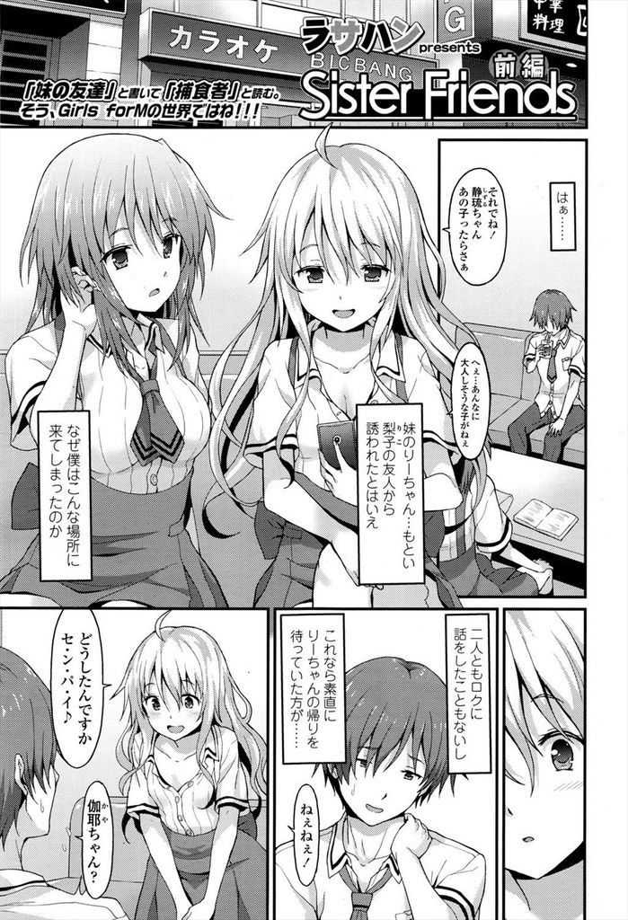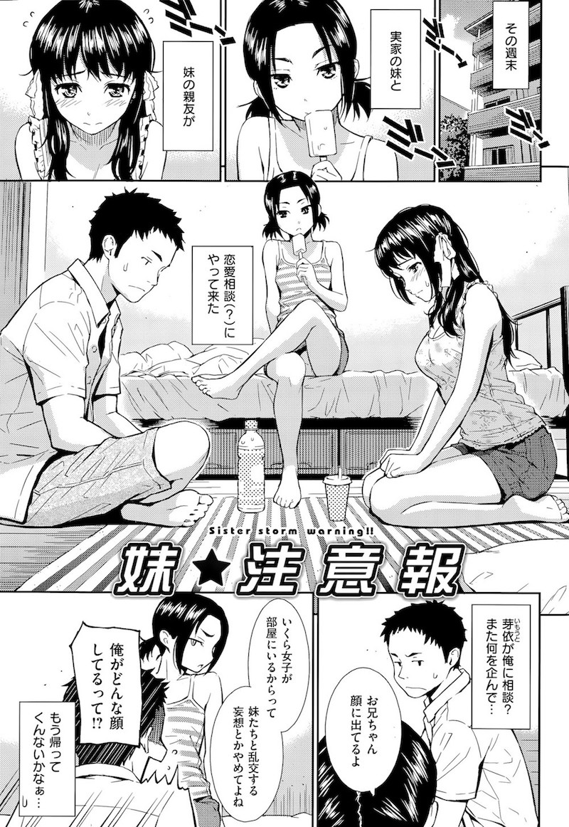 妹の事が大好きなシスコン兄が、親睦会という名目で妹の友人の小悪魔JK二人からカラオケに誘われて誘惑される!色仕掛けを断り帰ろうとしたら、呼び止められて襲われる!パンツを脱いだJKに顔面騎乗され、脱ぎたてパンティをチンコに被せられて足コキされる!射精すると、今度は貧乳JKにパイズリフェラされ、3P発展!大好きな妹に罪悪感を持ちながらも、筆おろしセックスして、膣内射精を決めてしまうのだった!実は、3P乱交の現場を覗き見してマンコを濡らしていた妹!